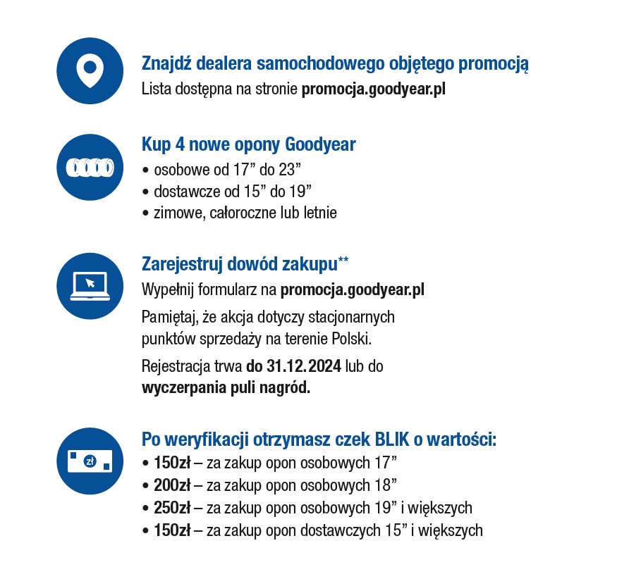 W okresie 01.09 – 31.12. 2024 – lub do wyczerpania zapasów, trwa akcja promocyjna Goodyear w której można zyskać od 150 zł do 250 zł. Przy zakupie w naszym serwisie wraz z montażem : 4 opon 17″-23″, lub dostawczych od 15″ do 19″ (4 takie same lub 2×2) – letnich, zimowych lub całorocznych marki GoodYear, należy zarejestrować ich zakup. Następnie po pozytywnej weryfikacji, środki zostaną przekazane jako cashback w postaci czeku BLIK. Wysokość nagrody zależy od rozmiaru i przeznaczenia zakupionych opon. Opony letnie, zimowe i całoroczne marki Goodyear zakupią Państwo w naszej firmie z gratisowym montażem, wyważaniem i ewentualną utylizacją starych opon. Serdecznie zapraszamy do wzięcia udziału w promocji !